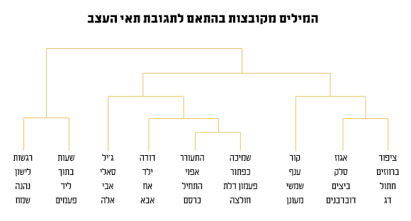 מילים מאותה קטגוריה, כמו דודה, ילד, אח ואבא, קובצו יחד. כלומר, תא העצב הגיב למילים המסוימות הללו, ולא למילים מקטגוריות אחרות כמו ציפור או רגשות. חלוקת המילים לפי תגובת תאי העצב | מתוך Jamali et al