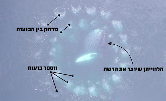 ניתוח התמונות העלה שכדי ליצור את אותה רשת בועות, הלווייתנים שחו במעגל מסביב לקבוצה של טרף קטן, לרוב קריל, ופלטו בועות אוויר מפתח הנשימה בקצב מהיר. "זה נראה כמו הרבה בועות מפוזרות, ולא נראה מובנה במיוחד", אמר אנדרו סבו (Szabo), שהוביל את המחקר, לנשיונל ג'יאוגרפיק. אבל המראה הראשוני הזה מטעה. לאחר שהם יוצרים את הטבעת הראשונה של הבועות, הגדולה יחסית, הלווייתנים יוצרים טבעת קטנה יותר בתוכה, ואז עוד טבעת, קטנה עוד יותר, בתוכה, וכך הלאה.