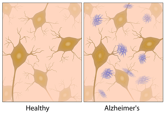 חלבונים מסוימים מצטברים ברקמת המוח ויוצרים משקעים. תאי העצב במוח בריא (שמאל) ובמוח עם אלצהיימר (ימין) | איור: Alila Medical Media, Shutterstock