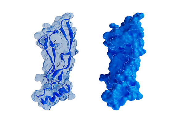 חלבון שהראה את הקשר החזק ביותר בינו ובין התפתחות דמנציה. שני מודלים לתיאור מבנה החלבון GDF15 (משמאל: פנים החלבון, מימין: פני השטח) | Thom Leach / Science Photo Library
