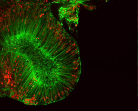 החוקרים חשפו את האורגנואידים לסדרה של אותות דמויי קוד מורס, שאפשרו להם ללמוד איך מתנהגת סדרה מתמטית. אורגנואיד מוח בשלבים מוקדמים. גרעיני התא באדום, גופי התא בירוק | צילום: מעיין קרלינסקי צור