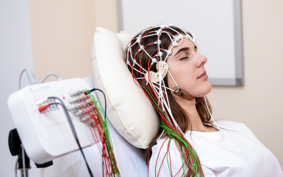 כל אלקטרודה מקליטה את הפעילות של תאי העצב הסמוכים אליה. אישה עוברת בדיקת רִשְׁמַת מוח חשמלית (EEG) | מקור: Roman Zaiets, Shutterstock
