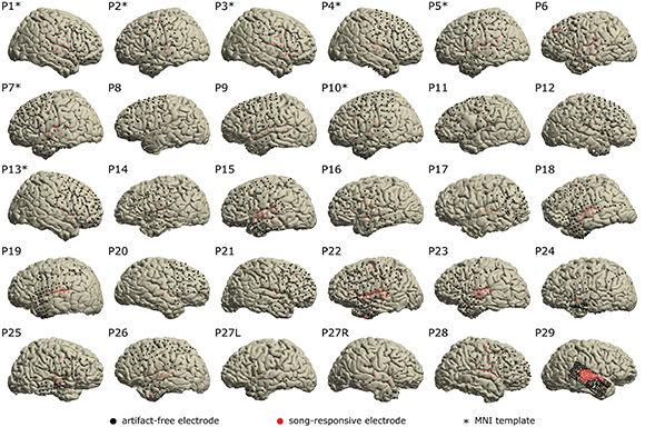 כיסוי האלקטרודות במוחותיהם של 29 מטופלים. הנקודות האדומות מייצגות אלקטרודות שהגיבו למוזיקה | מתוך מאמר המחקר