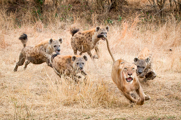 מנצלים את היתרון המספרי. ארבעה צבועים רודפים אחרי לביאה בשמורת לונדולוזי בדרום אפריקה | צילום: LONDOLOZI IMAGES / MINT IMAGES / SCIENCE PHOTO LIBRARY