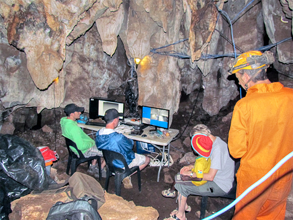 ברגר וצוותו החליטו להשאיר חלק גדול מהמאובנים במקום שבו נמצאו. חוקרים באחד החללים הקלים יותר לגישה של מערכת המערות, מנטרים את החפירה בחללים העמוקים | flickr, Simon Fraser University