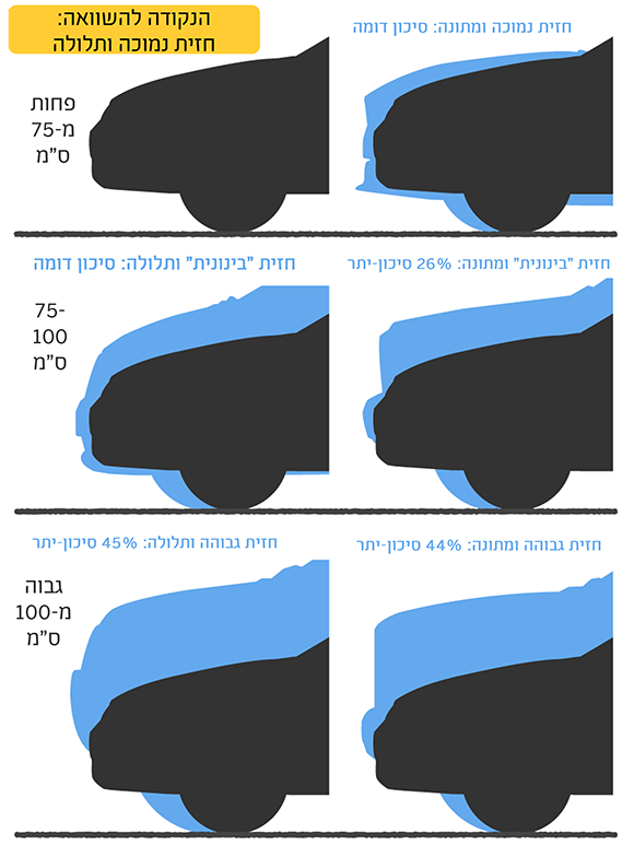 מכוניות בעלות מכסה מנוע שטוח היו קטלניות יותר ב-25 אחוז לעומת אלה שמכסה המנוע שלהן היה נטוי בחדות. גורמי הסיכון המרכזיים לפי המחקר החדש. אילוסטרציה מאתר IIHS, עברית: יהונתן ברקהיים