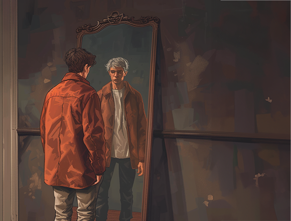 הגיל הביולוגי, כלומר מצבם הביולוגי של האיברים, אינו תואם תמיד את הגיל הכרונולוגי. אדם צעיר מביט בבבואתו הזקנה במראה | שירה הולנד באמצעות מידג'רני
