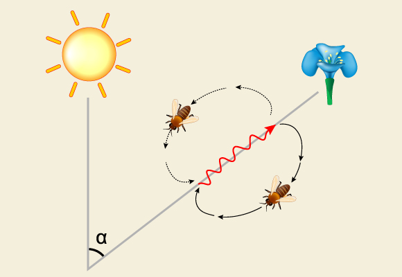 כשהמזון רחוק, הדבורה זוכרת מאיזה צד האירה השמש במעופה אל המזון, וכשהיא חוזרת אל הכוורת היא מציגה בריקודה את הכיוון והמרחק. אילוסטרציה של ריקוד השמינייה של הדבורה | Shutterstock, Designua