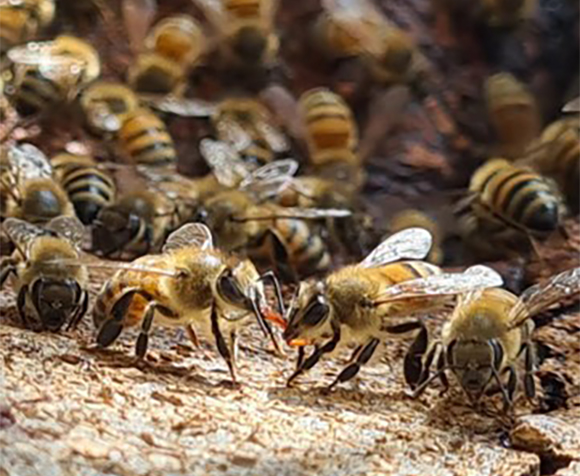 הדבורה מוסרת לשכנותיה טעימות מהצוף שהביאה, בפעולה של האכלה הדדית | צילום: יאיר לופו. קישור לתמונות נוספות