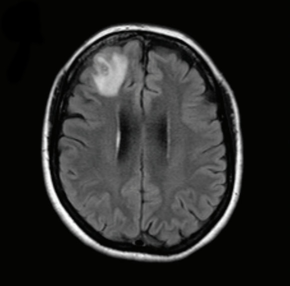 בדיקת MRI של מוחה מצאה נגע באוּנה המצחית הימנית. תמונה מה-MRI, עם הנגע בפינה השמאלית העליונה | מתוך המאמר, Hossain M. et al., Emerg Infect Dis. 2023