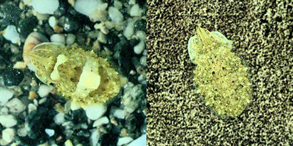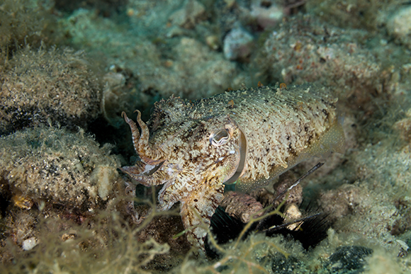 מפעיל תאי פיגמנט וגבשושיות על העור וכך מתאים את צבעו ומרקמו לסביבה. דיונון הרוקחים נטמע ברקע | Gerald Robert Fischer, Shutterstock