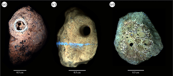 החוקרים בחנו מקרוב שלוש לוחיות עצם בקוטר כמה סנטימטרים כל אחת, שעליהן היו סימנים לעיבוד בעזרת כלים. בשתיים מהן היה חור בעל שוליים אחידים, שמעידים לטענת החוקרים על כך שנעשו בידי אדם. בלוחית השלישית היו שני חורים שבורים סמוך לקצוות. "חורים שלמים או חלקיים נקדחו ליד קצות הלוחיות, כמו שעושים כאשר רוצים לתלות משהו על חוט", סיכמה מיריאן פאצ'קו (Pacheco), החוקרת הבכירה החתומה על המאמר, בריאיון לניו-יורק טיימס.