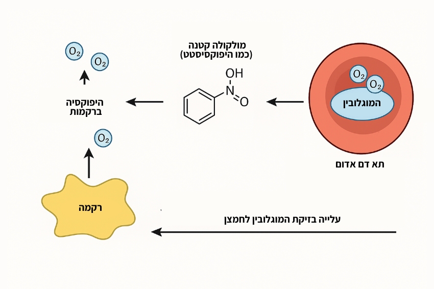 היפוקסיסטט נקשרת להמוגלובין ומעלה את זיקת הקישור לחמצן, לכן פחות חמצן משתחרר לרקמות, מה שמוביל למצב של היפוקסיה ברקמות למרות שיש הרבה חמצן בדם | גליה שדה באמצעות DALL-E