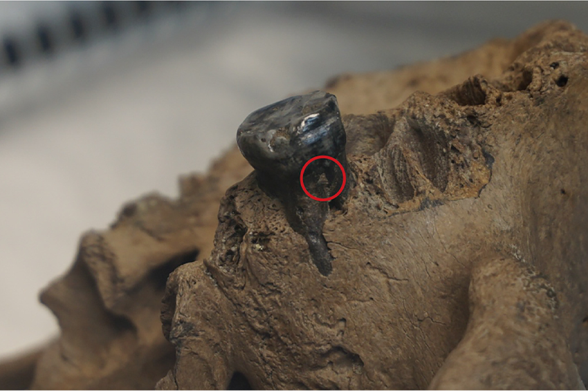 לאחר שלא הצליחה להשיג חומר גנטי מהשן עצמה, פנתה פו לרובד החיידקים המאובן שנוצר על השן. השן והרובד שעליה | מתוך מאמר המחקר Fu et al. 2025