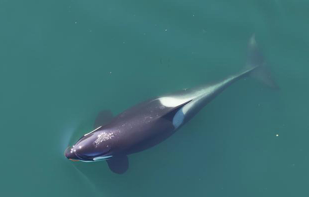 הדולפינים השתמשו בגבעול אצה לשפשף זה את זה. קטלן עם אצת קלפ בפיו | צילום: Center for Whale Research, NMFS NOAA Permit 27038, CC BY-SA
