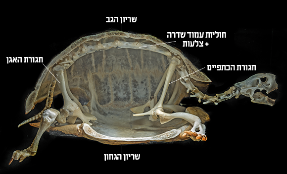 ממה עשוי השריון? השריון עשוי מעצם ומכוסה בעור דקיק המכוסה בלוחיות קרטין, אותו חלבון שממנו עשויים הציפורניים והשיער שלנו. בית החזה של הצב – הצלעות, חוליות עמוד השדרה ועצם החזה – התאחו ויצרו שריון שמורכב מחלק עליון וחלק תחתון.