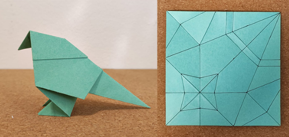 מימין: קיפול של ציפור. משמאל: פריסת הדף המקופל מציגה את תבנית הקיפולים. הקו האלכסוני החוצה את הדף הוא ציר הסימטריה | צילומים: טל סוקולוב