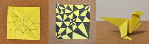 מימין לשמאל: קיפול אוריגמי שטוח של דינוזאור; תבנית הקיפולים של הדינוזאור; צביעת התבנית בשני צבעים – שום זוג מצולעים שחולקים קשת לא נצבע באותו צבע | צילומים: טל סוקולוב