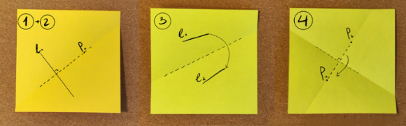 בהינתן נקודה וקו על הדף, יש קיפול אנכי יחיד לקו שעובר דרך הנקודה.