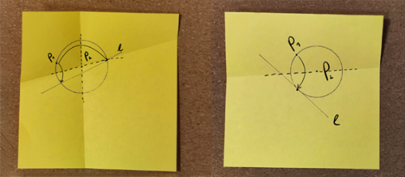 מימין: ישר משיק למעגל, משמאל: ישר חותך את המעגל. בעזרת קיפולי נייר אפשר למצוא את נקודות החיתוך, ולמעשה לפתור משוואה ריבועית | צילומים ואיורים: טל סוקולוב