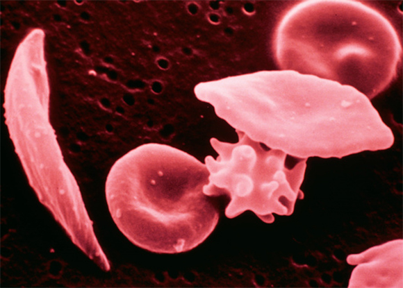 החולים באנמיה חרמשית זוכים ליתרון הישרדותי באזורים מוכי מלריה. צילום ממיקרוסקופ אלקטרונים של תאי דם אדומים מאדם החולה במחלה, מראים את המראה החרמשי האופייני | Jackie Lewin, Royal Free Hospital, Science Photo Library