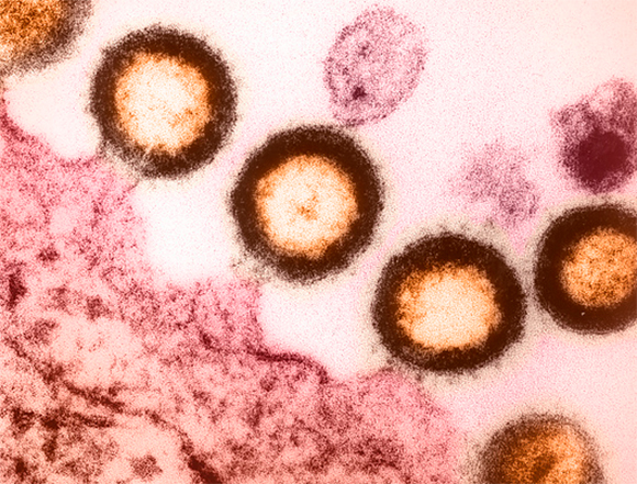 המוטציה שמעניקה הגנה מפני הנגיף נמצאת על גֵן שאחראי על ייצור קולטן על פני תאי מערכת החיסון. צילום מיקרוסקופ אלקטרונים של חלקיקים נגיפיים יוצאים מתא דם לבן | NIAID, National Institutes of Health, Science Photo Library
