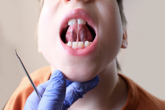 הדרך הפשוטה ביותר לברר אם יש לשון קשורה היא לבדוק אם קיימת מגבלה משמעותית בתנועתה. רופאה בוחנת את הפרנולום | מקור: Kittyfly, Shutterstock