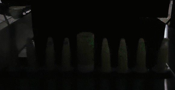 בִּיּוֹלוּמִינֵסֶנְצִייָה לחנוכה – חנוכיה דוידסונית ממבחנות המכילות חלבון GFP זוהר | צילום: אלכסנדרה אברוטין