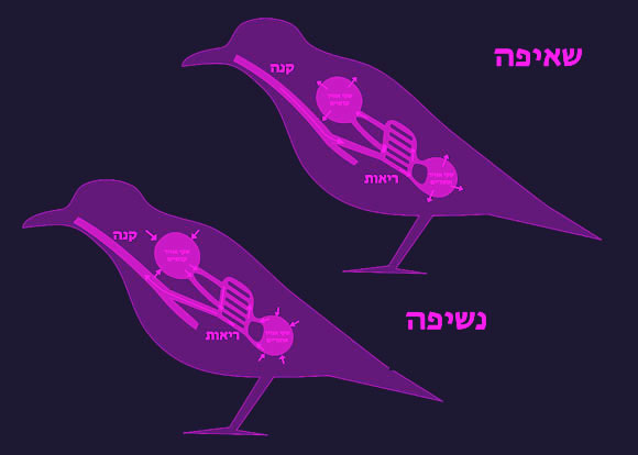 נשימה יעילה. שקי האוויר של הציפורים וזרימת החמצן בגופן בעת הכנסת והוצאת אוויר| מקור: ויקיפדיה, L. Shyamal, נחלת הכלל