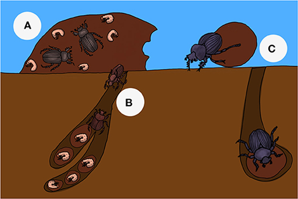 זבליות שמטילות במרומי התלולית (A), כאלה שחופרות מתחתיה (B) או כאלה שמגלגלות כדור זבל למקום אחר (C) | איור מתוך: Manning, Ong and Slade, Frontiers for Young Minds