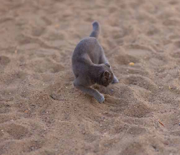 לחתולים שאינם טורפי-על כדאי לקבור את הצואה שלהם, כדי לא להסגיר את מיקומם לטורפים גדולים מהם. חתול מכסה את הפרשותיו | צילום: Vershinin89, Shutterstock