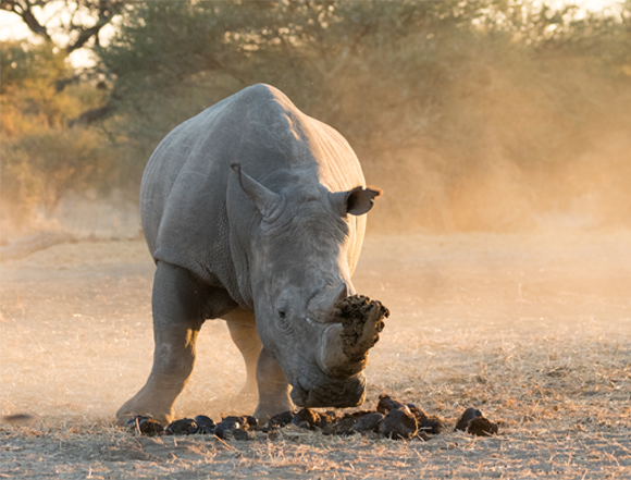 הרשת החברתית של השכונה. קרנף בבוצואנה מתעדכן ברכילות האחרונה בערימה של קקי טרי | צילום: John Ceulemans, Shutterstock