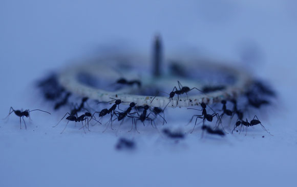 כשנמלה מוצאת מזון שהיא אינה יכולה לסחוב בכוחות עצמה, היא מפרישה סימון כימי הקורא לנמלים נוספות. לא ברור בינתיים מתי וכיצד יודעות הנמלים שהכוח שגויס גדול דיו למשימה, אבל בשלב מסוים הן מרימות את העצם שמצאו ומתחילות לשאת אותו לכיוון הקן. תצפיותיו של ד"ר אהוד פוניו, מדען סגל במעבדה של פרופ' עופר פיינרמן במחלקה לפיזיקה של מערכות מורכבות במכון ויצמן למדע, הניבו תמונה מפתיעה: הנמלים הנושאות מטען יחד אינן צועדות על השביל עצמו, אלא סוטות ממנו לנתיב אחר. הן מתקדמות באופן כללי לכיוון הקן אך לא בנתיב הקצר ביותר, ומדי פעם הן עוצרות ומתקנות את הכיוון.