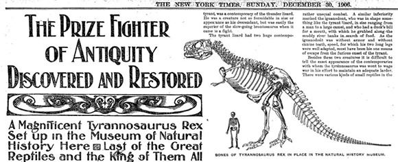 אחרון הזוחלים הגדולים, והמלך שלהם! הכריזה הכותרת בניו-יורק טיימס ב-1906, וקראה לציבור לבוא ולראות את השלד המוצג במוזיאון | נחלת הכלל