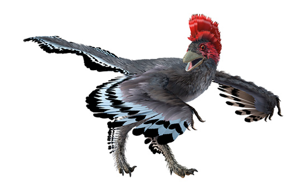 ההשערה המרכזית כיום היא שהנוצות שימשו לשמירה על חום גופם של הדינוזאורים, וייתכן שבנוסף הן גם היו צבעוניות ושימשו לחיזור. אילוסטרציה של דינוזאור מסוג אנכיאורניס (Anchiornis), עם נוצות על זרועותיו ורגליו ו”כרבולת” נוצות אדומה | Carlton Publishing Group / Science Photo Library