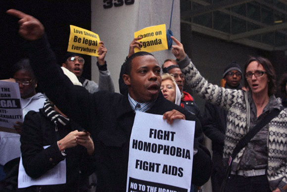 הנגיף הגיע מאפריקה לצפון אמריקה דרך האיים הקריביים. הפגנה בניו-יורק למען נשאי HIV וחולי איידס באוגנדה מקור: ויקיפדיה
