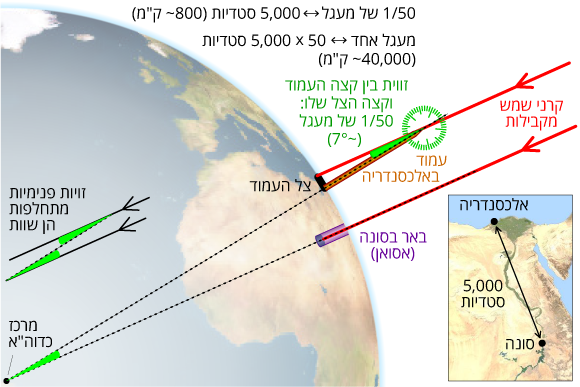 חישב את היקף כדור הארץ עם עמוד וגיאומטריה. המחשת החישוב של ארתוסטנס | מתוך ויקיפדיה,  cmglee, David Monniaux, jimht