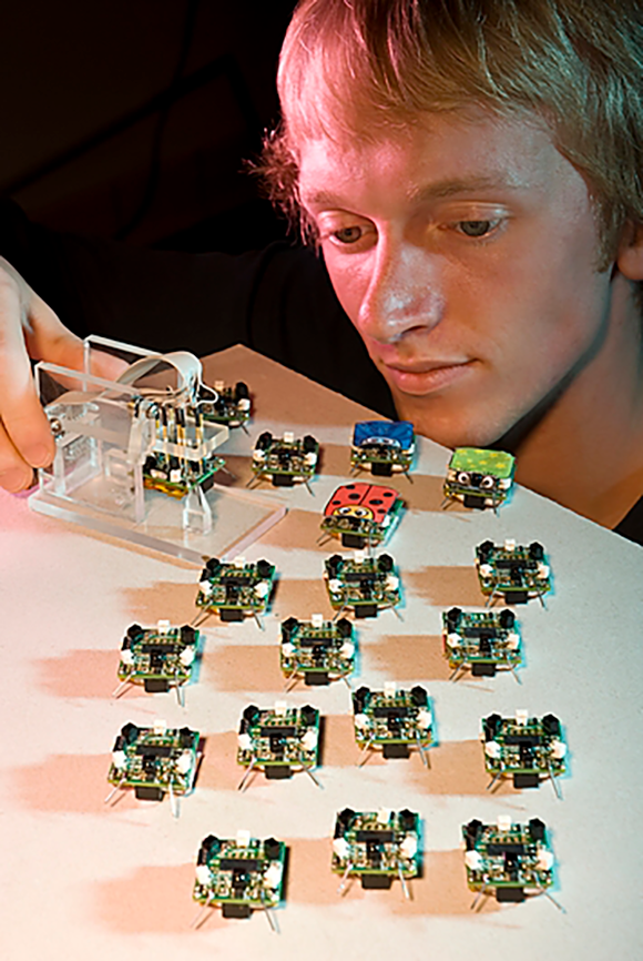 מנסים לשלב את הידע המצטבר על התנהגות הארבה לפיתוח רובוטים נחיליים. חוקר מסתכל על הרובוטים שבנה, שאומנו לעבוד בשיתוף פעולה מבוסס על כללים פשוטים | Brian Bell / Science Photo Library