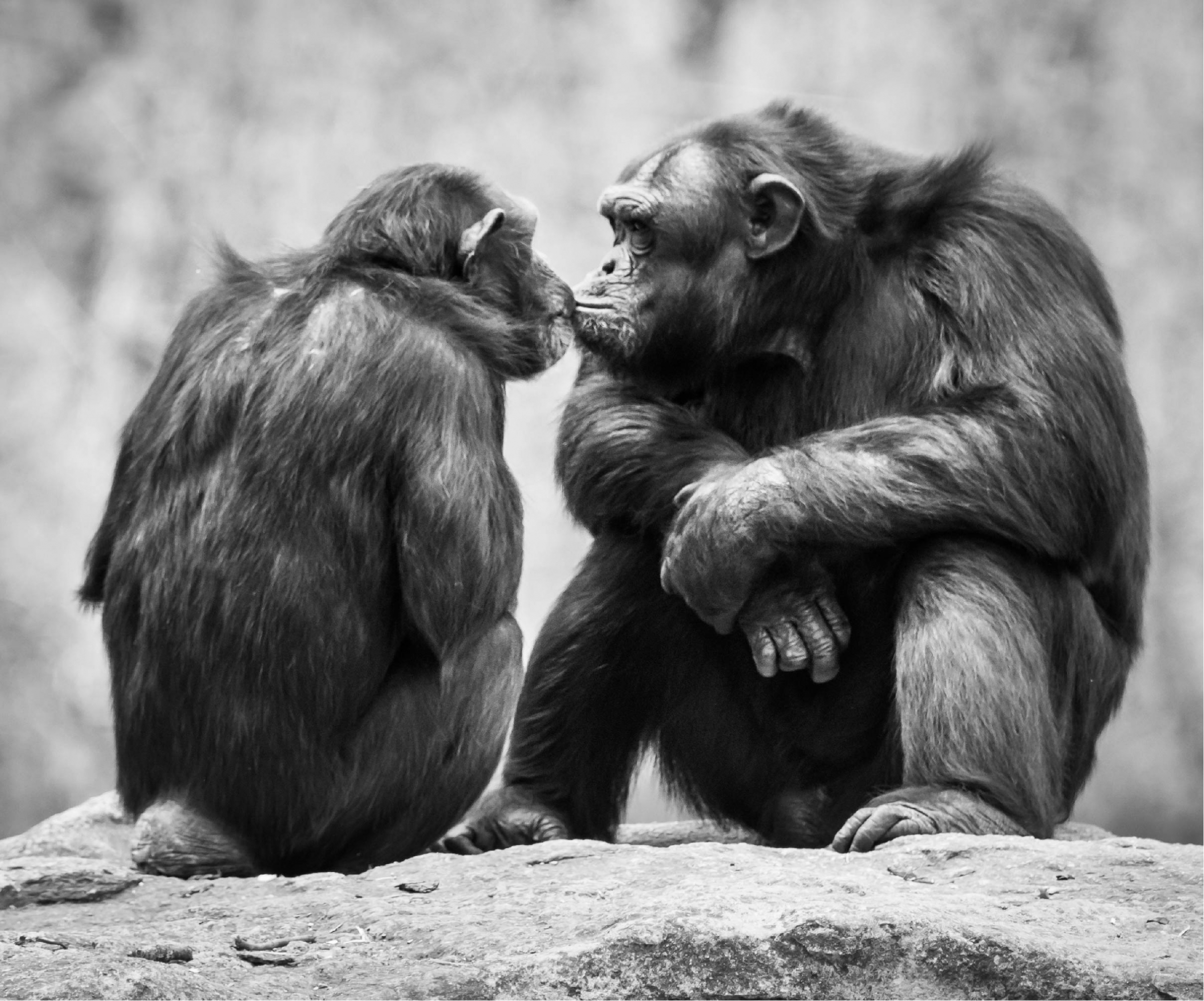 לשימפנזים יש מערך התנהגויות אופייניות שהם מציגים לאחר ריב, שכולל חיבוקים ונשיקות. שני שימפנזים מתנשקים | Shutterstock, Abeselom Zerit