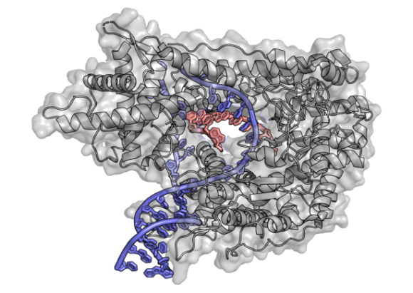 חוקרים הצליחו לייצר גרסת מראה ימנית של האנזים שאחראי על ייצור RNA מהחומר התורשתי. RNA-פולימראז עם גדילי RNA ו-DNA | מקור: Litvinanna, Wikimedia