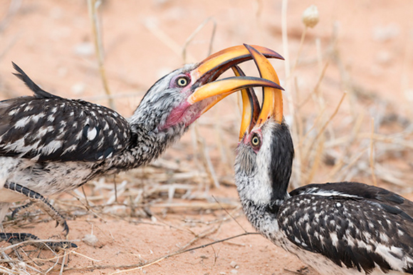 יש שיטות שונות לסימון טריטוריה כגון שירים, קריאות וחומרי ריח. שתי ציפורי טוקוס צהוב-מקור דרומי מתגוששות | מקור: Tony Camacho / Science Photo Library