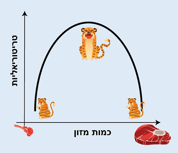 כשהמזון דל – אין טעם להשקיע משאבים רבים בהגנה עליו, כשכמותו עולה – משתלם להגן עליו וכשהכמות עולה עוד יותר – יש מספיק לכולם. עקומה המתארת את הקשר בין כמות המזון הזמין ובין מידת הטריטוריאליות | איור: יונת אשחר