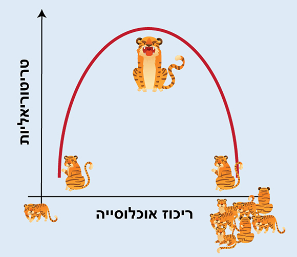 משערים שבעלי החיים יפגינו מידה רבה של טריטוריאליות כאשר ריכוז האוכלוסייה איננו גבוה מאוד או נמוך מאוד. עקומה המתארת את הקשר בין ריכוז האוכלוסייה ובין מידת הטריטוריאליות | איור: יונת אשחר
