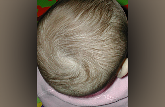 אצל כמה אנשים ספירלת השיער צומחת דווקא נגד כיוון השעון. שיער הראש של בת שנה צומח עם כיוון השעון | צילום: Noj Han, CC BY-SA 2.0, Flickr, via Wikimedia Commons