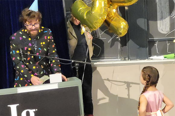 כנהוג בטקס, כשנאום הזוכים התארך עלתה לבמה ילדה קטנה ואמרה להם שוב ושוב: "בבקשה תפסיקו, משעמם לי". אורי ז'יטומירסקי, שמילאה את התפקיד השנה, מפסיקה את נאומו של זוכה איג נובל לדמוגרפיה | בני ז'יטומירסקי