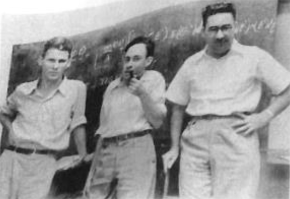 עבור כמעט כולם, הפעילות בחמ”ד הייתה התנסות ראשונה מסוגה בפיזיקה שימושית. גדעון יקותיאלי, אורי הבר-שיים וחוקר נוסף, יהודה ייבין, שותפים למחקר בקרינה קוסמית, 1952 | מתוך הספר “ימי חמד”, מכון ויצמן למדע, 1996