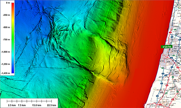 מפה של פני השטח מתחת לפני הים של הפרעת פלמחים. קו החוף באדום, האלמוגים בעומק בינוני בירוק-צהבהב ונביעות המתאן באזור הכחול הכהה | מקור: יצחק מקובסקי, אוניברסיטת חיפה, דו"ח ל-FRA