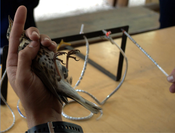 מטבע מוסמך אוחז בציפור בתהליך הטיבוע בתחנה לחקר הציפורים בירושלים. קיכלי רונן עומד לקבל טבעת במידתו לפני שישוחרר לדרכו | צילום: קסניה ז'ורבל