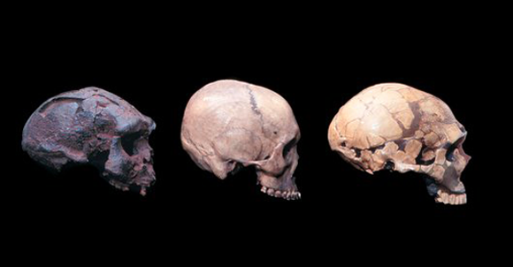 האם הסוד לגוף הגדול ולמוח המפותח טמון בבשר? גולגולת של הומו ארקטוס (משמאל), לצד גולגולת של אדם מודרני (באמצע) ושל אדם ניאנדרטלי | Natural History Museum, London / Science Photo Library