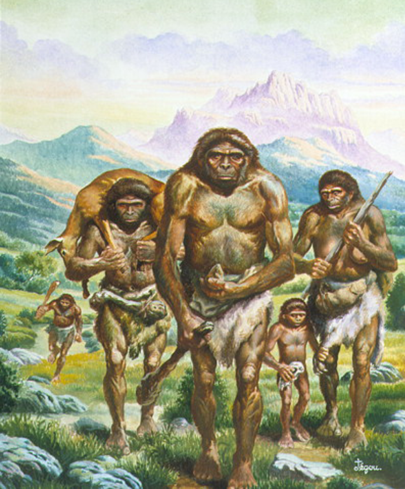 כלים ששימשו בוודאות לציד הם רק בני כחצי מיליון שנים, אבל בהחלט ייתכן שבני אדם ממינים שונים צדו קודם לכן. ציור של הומו ארקטוס חוזרים מציד | Christian Jegou / Science Photo Library